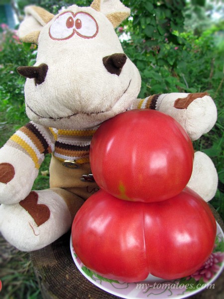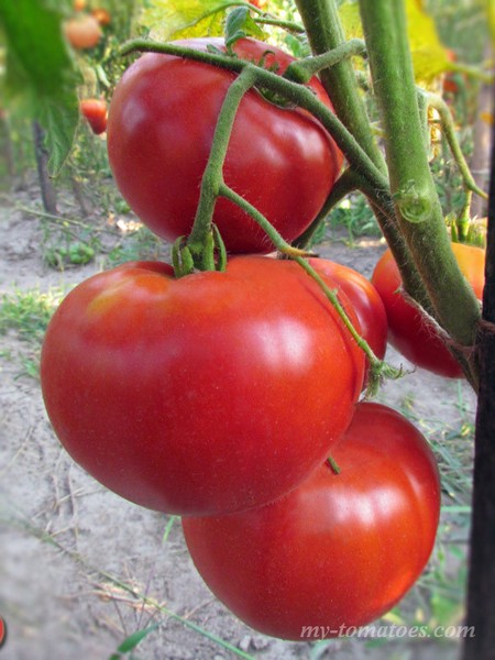 Отличный среднеспелый и высокоурожайный сорт. Растение высотой 1,4-1,7м. Формирует обильный урожай красивых сердцевидных плодов красного цвета, массой 300-400г (первые – до 500г и более). Томаты довольно плотные и лёжкие, все выровненные, мясистые и ароматные, сладкие, превосходных вкусовых качеств.
