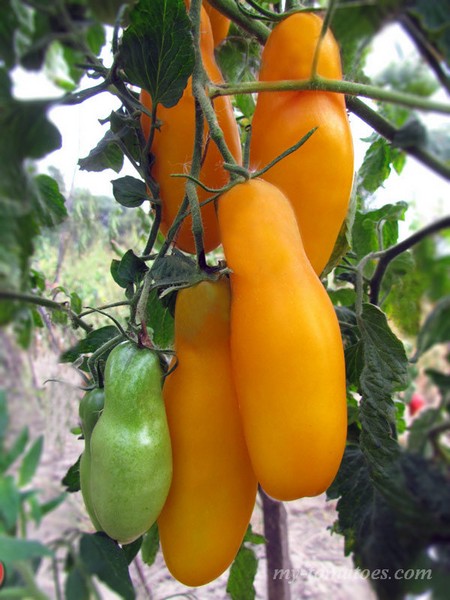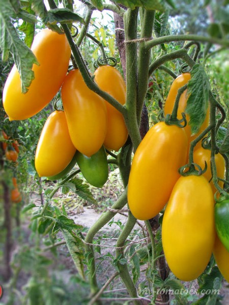 Отличный среднеранний сорт. Растение высотой до 2м и более. Все растение опоясано гирляндовидными кистями аккуратных цилиндрических плодов, массой 100-120г. Томаты сахаристые, умеренно плотные, золотисто-жёлтой окраски, не растрескиваются, красивые и очень вкусные в свежем виде.