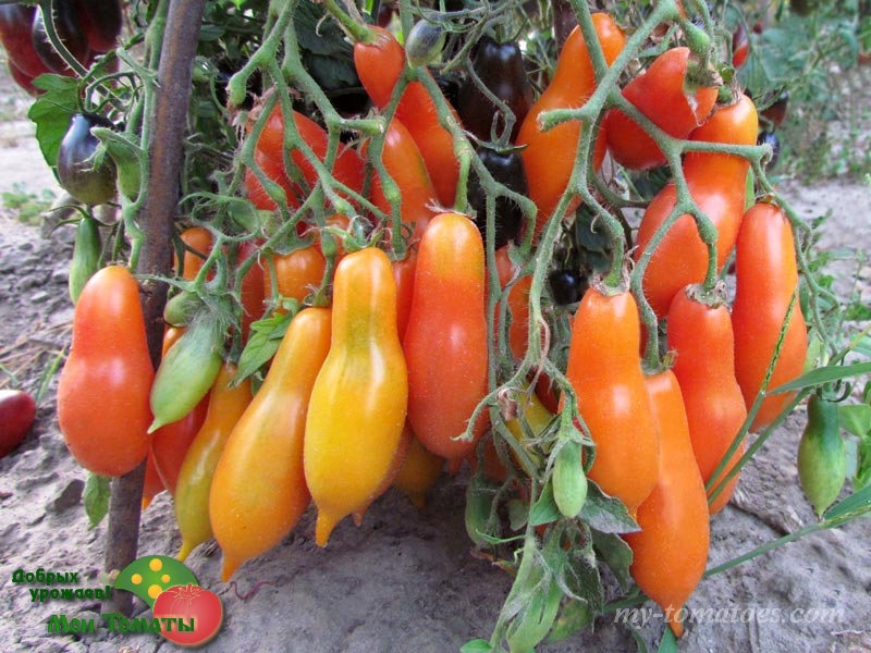 Очень урожайный, высокорослый сорт с очень красивыми, многочисленными плодами - сливками яркого персикового цвета. Сорт среднеспелый, куст высотой 1,7-1,9 м, лист тонкий поникающий, формировка в 2-3 стебля, образует сложные кисти по 25-30 плодов одновременно. Плоды изящной пальчиковой формы, зауженные ближе к плодоножке, с острым носиком, оранжевого цвета, весом 60-90 г. Томаты с плотной кожицей и вкусной, густой мякотью, могут довольно долго храниться после сбора. Мякоть сладкая, сахаристая, с малым количеством семян. Одна из лучших новинок этого сезона!