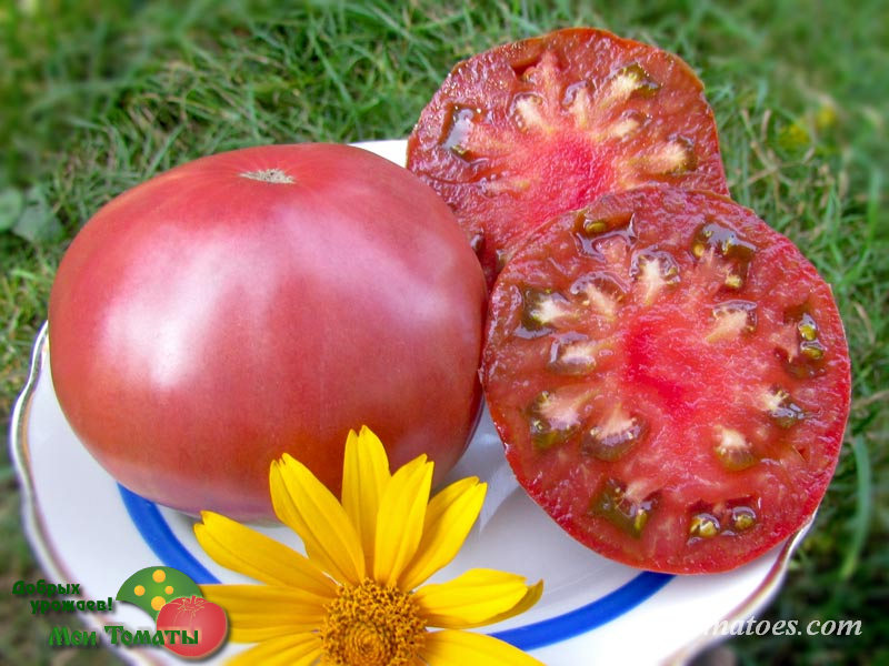 Сорт выведен в Украине, г. Брусилов. Среднерослый (1,1-1,5м), среднеспелый, очень урожайный сорт. Плоды конусовидно-сердцевидной формы, красивые. Томат очень мясистый, плотный, некоторые томаты почти без семян, вкус нежный, сочный, гармоничный, мякоть арбузная. Масса 250-400г и выше. Цвет насыщенно малиновый, искрящийся. Без зеленых плечиков, весь равномерно окрашен, не подвержен ни плодовой гнили, ни другим болезням.