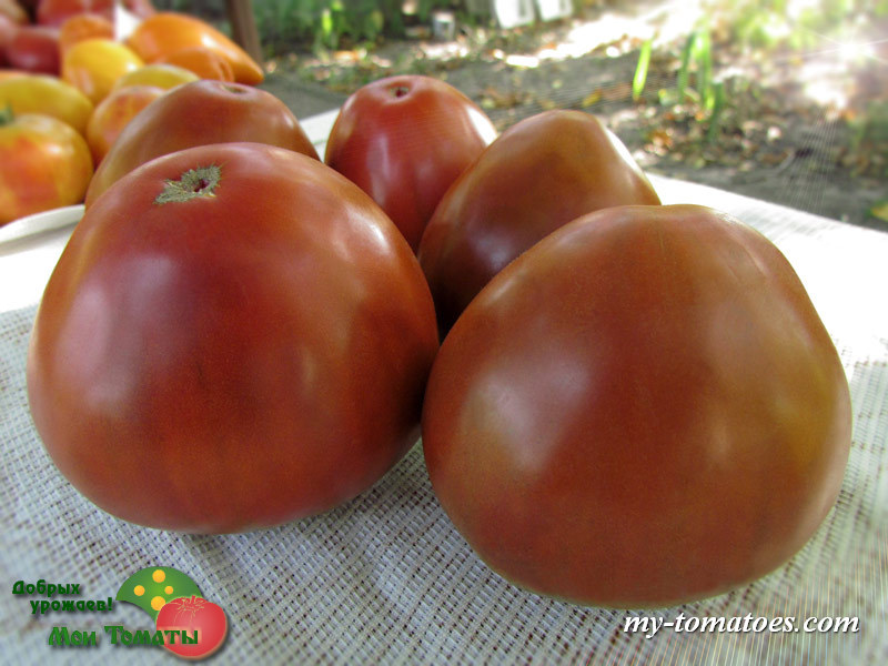 Среднеспелый урожайный сорт. Плоды крупные, сердцевидной формы, шоколадно-красного цвета, массой 300-700 г. Томаты мясистые, сочные, достаточно плотные. Мякоть густая, сладкая, с лёгким фруктовым ароматом, без кислоты. Сорт с длительным периодом плодоношения до самых заморозков. Кусты высотой до 1,8 м.
