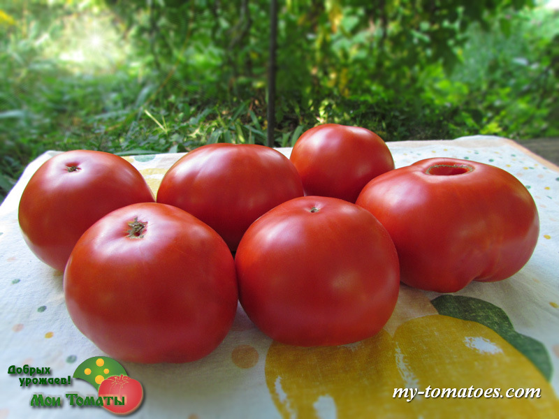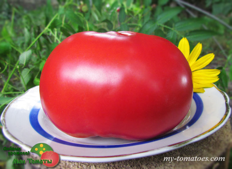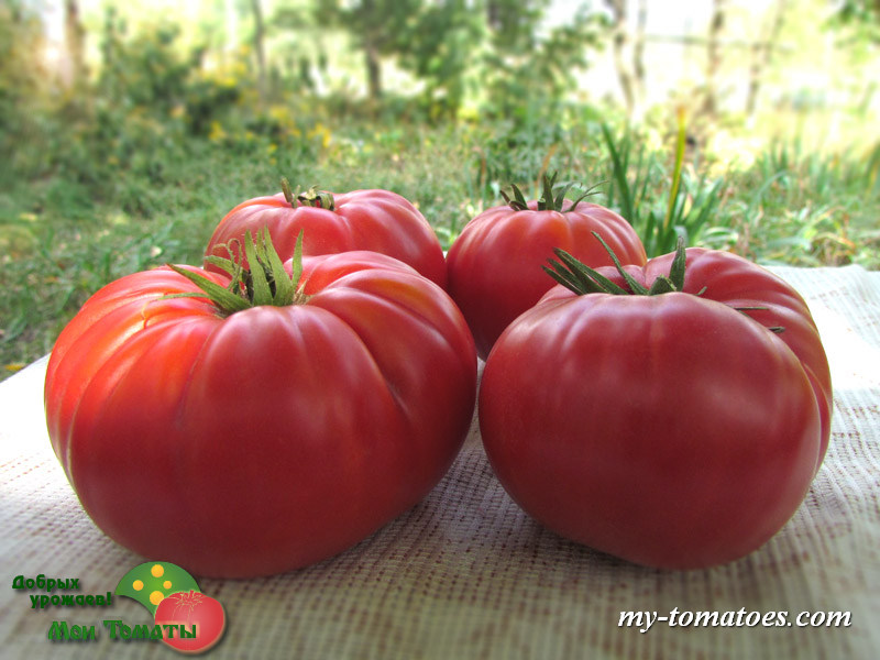 Среднеспелый, суперурожайный сорт. Один из наиболее понравившихся сортов в сезоне 2019г. Красив на вид, и ещё лучше на вкус. Куст мощный, с пышной листвой, высотой 1,5-1,7м. Плоды ярко-красного цвета, плоскоокруглые, ребристые у плодоножки, массой 300-500г (в благоприятных условиях – до 1кг). Великолепный вкус старинного типа. Мякоть насыщенного красного цвета, сочная, мясистая, малосемянная, является основой для приготовления замечательного соуса. Имеет Великолепный сладкий вкус старинного типа.