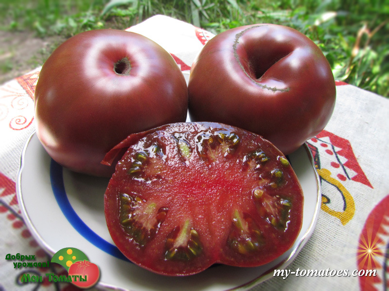 Очень привлекательный и урожайный среднеспелый сорт. Куст крепкий, высотой около 1,5м. Формирует плоскоокруглые плоды необычайно красивой и тёмной фиолетово-коричневой окраски. Томаты мясистые, сочные, массой до 300г, обладают богатым и сложным ароматом, имеют приятный сладкий вкус. Мякоть глубоко-фиолетового цвета с лёгким розовым оттенком.