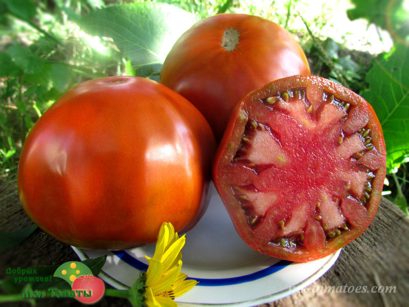 Урожайный среднеспелый и крупноплодный сорт. Куст высотой 1,5-1,7м, лист обычного типа. Формирует большие плоды удивительной окраски: шоколадные с красным оттенком и блестящей кожицей; мякоть – тёмно-бордового (рубинового) цвета. Томаты плоскоокруглой (порой – слегка сердцевидной) формы, умеренно плотные, мясистые, малосемянные, массой 300-600г. Обладают богатым ароматом и сладким вкусом, с лёгким оттенком цитрусовых как у старых добрых сортов.