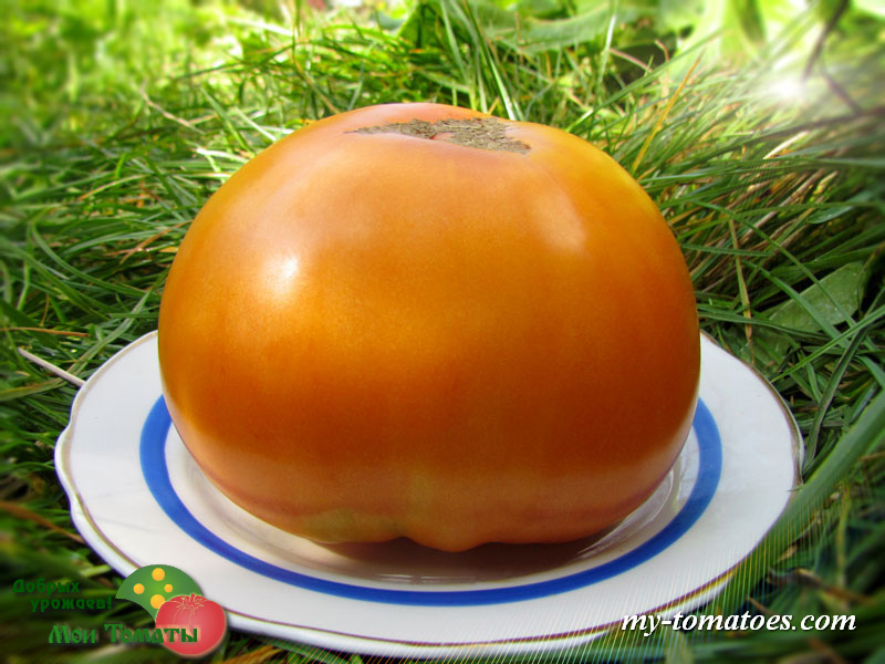Сорт среднеспелый, урожайный. Растение высотой около 1,7м. Плоды очень красивые – яркие, насыщенно-оранжевой окраски, плоскоокруглые, мясистые, бифштексного типа, массой 400-500г (отдельные – более 600г), с превосходным сладким вкусом, малосемянные.