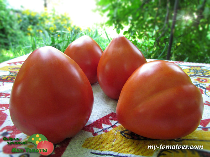 Отличный среднеспелый и высокоурожайный сорт. Растение высотой 1,4-1,7м. Формирует обильный урожай красивых сердцевидных плодов красного цвета, массой 300-400г (первые – до 500г и более). Томаты довольно плотные и лёжкие, все выровненные, мясистые и ароматные, сладкие, превосходных вкусовых качеств.