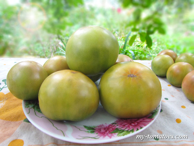 Среднеспелый урожайный сорт. Куст высотой около 1м. Плоды округлой формы (первые – округло-приплюснутые), ровные, при полном созревании - зелёные с очень привлекательным розовым румянцем, массой 80-140г. Чрезвычайно вкусные и ароматные.