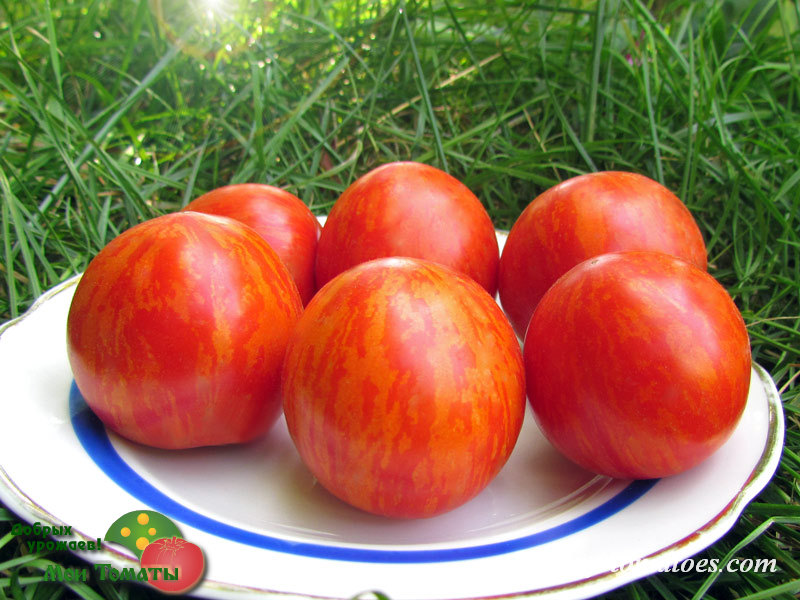 Новый карликовый сорт, был представлен компанией Victory Seed Company для сезона садоводства 2021 года. Среднеспелый, низкорослый (около 70-80см), урожайный томат с полосатыми округлыми плодами. Плоды с гладкой кожицей, шарообразной формы, в стадии зрелости ярко-красные с желтыми полосками. Средний вес плода 120-150 граммов. Мякоть насыщенного алого цвета, сочная, вкусная. Эти помидоры вкусны в свежем виде, подойдут они также для консервирования.