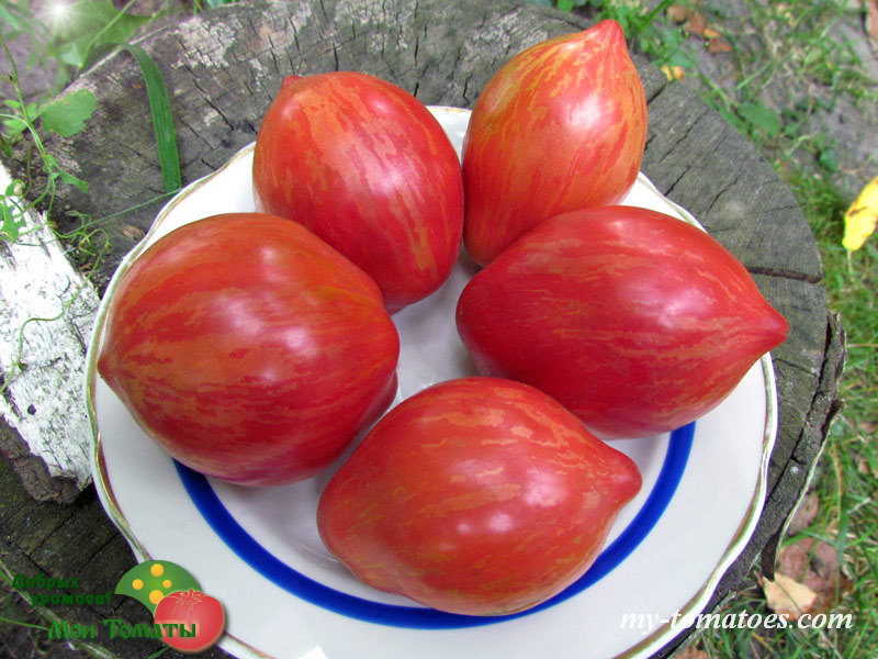 Среднеспелый, очень красивый и декоративный, урожайный сорт. Куст высотой 60-70см. Плоды округлой или слегка приплюснутой формы, темно-бордовые с зелеными полосками, массой 80-200г, типа «мини» стейк. Мякоть темно-бордовая, сочная и очень вкусная.