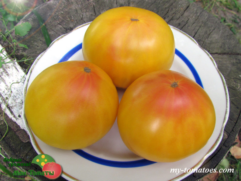 Среднеспелый, урожайный сорт с крупными и очень привлекательными плодами. Куст высотой 60-90см, лист обычного типа, морщинистый. Плоды плоскоокруглой формы, золотисто-жёлтые, мясистые и довольно плотные. Томаты массой 180-300г, с сочным, хорошим, мягким, хорошо сбалансированным вкусом. Идеально подходят для бутербродов, соусов, нарезки, свежей еды, гарнира и т.п.