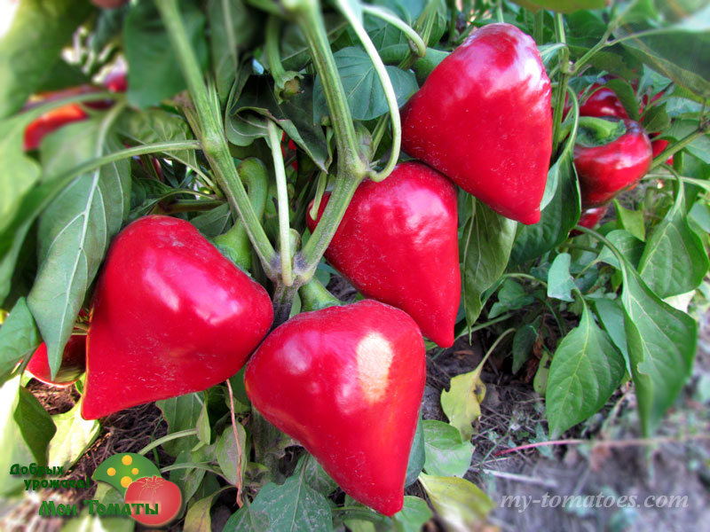 Раннеспелый (110-120 дней от всходов до технической спелости), очень урожайный, засухоустойчивый сорт, привлекающий внимание оригинальной формой плодов. Растение низкорослое, около 40-50 см, хорошо облиственное, интенсивно загруженное завязью. Плоды конусовидно-сердцевидной формы с острым носиком, глянцевые, при полном созревании вишнёво-красного цвета, массой до 150-170г. Толщина стенки 5-7мм. Мякоть умеренно сочная, сладкая и ароматная. Отлично транспортируется, долго сохраняет прекрасные вкусовые качества и товарный вид.
